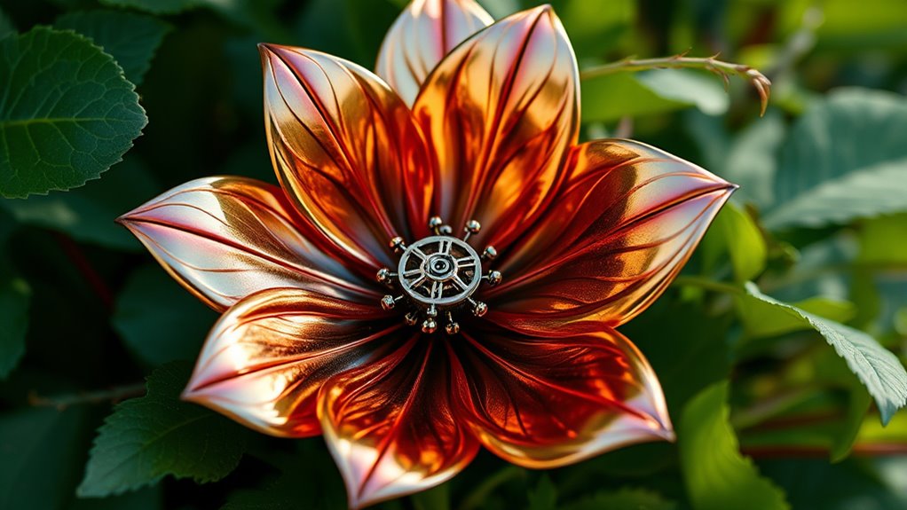You’ll find that creating mechanical botanical sculptures often involves using synthetic fibers and metal alloys. Synthetic fibers provide flexibility and durability, mimicking natural plant textures, while metal alloys like brass or aluminum give structure and a sleek, modern look. These materials are chosen for their strength, lightweight properties, and ease of shaping, allowing you to craft intricate, long-lasting sculptures that blend organic aesthetics with technological innovation.