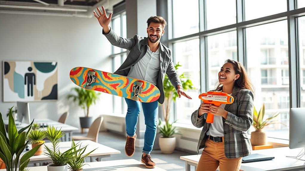 Remember when a simple game broke down barriers during a team retreat? That day, everyone realized that blending fun with professionalism sparks creativity and strengthens bonds. Just like a well-balanced recipe, mixing play with work keeps things engaging without losing focus. When you embrace serious fun, you unseal your team’s full potential—turning everyday tasks into opportunities for innovation and connection. So go ahead, infuse your work with a little play, and watch everyone thrive.
