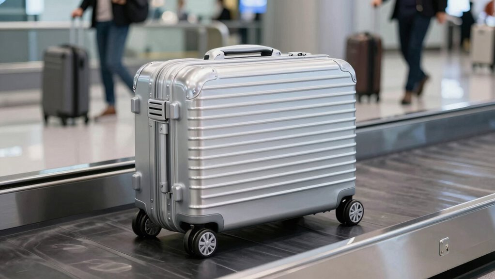 Back in the day, aluminum was seen as a symbol of durability, and today, it’s eco-friendly too. Aluminum luggage offers recyclability benefits, making it a greener choice. It’s produced through eco-friendly manufacturing processes that reduce environmental impact. By choosing aluminum carry-ons, you help cut waste and support sustainability. Plus, their longevity means fewer replacements, further benefiting the environment in the long run.
