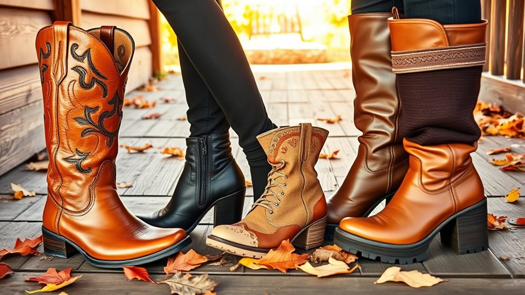 For fall footwear, switch up your style with bold cowboy boots for a rustic chic look, pairing them with flowy dresses or jeans. Knee-highs are practical and versatile, perfect for colder days and layered outfits, in rich hues like black or burgundy. Don’t forget platform shoes—these chunky, statement pairs add height, comfort, and an edgy vibe to your outfits. Keep exploring to discover how these trendy options can transform your fall wardrobe into a stylish statement.