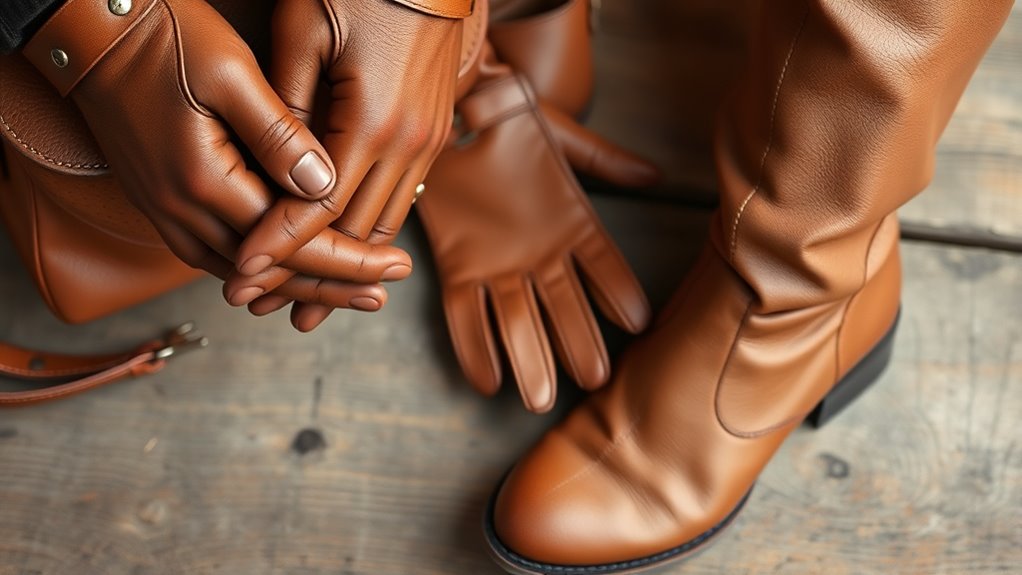 If your leather accessories get wet, let them air dry naturally—never use direct heat, which can cause cracking. Once dry, reapply a leather conditioner to restore moisture. For boots, applying a protective wax or balm can help preserve the surface and keep them looking their best through fall’s unpredictable weather. Taking these simple steps not only prolongs the life of your accessories but also ensures they continue to look stylish season after season. Maintaining your leather with proper care practices is essential for ensuring durability and timeless appeal.