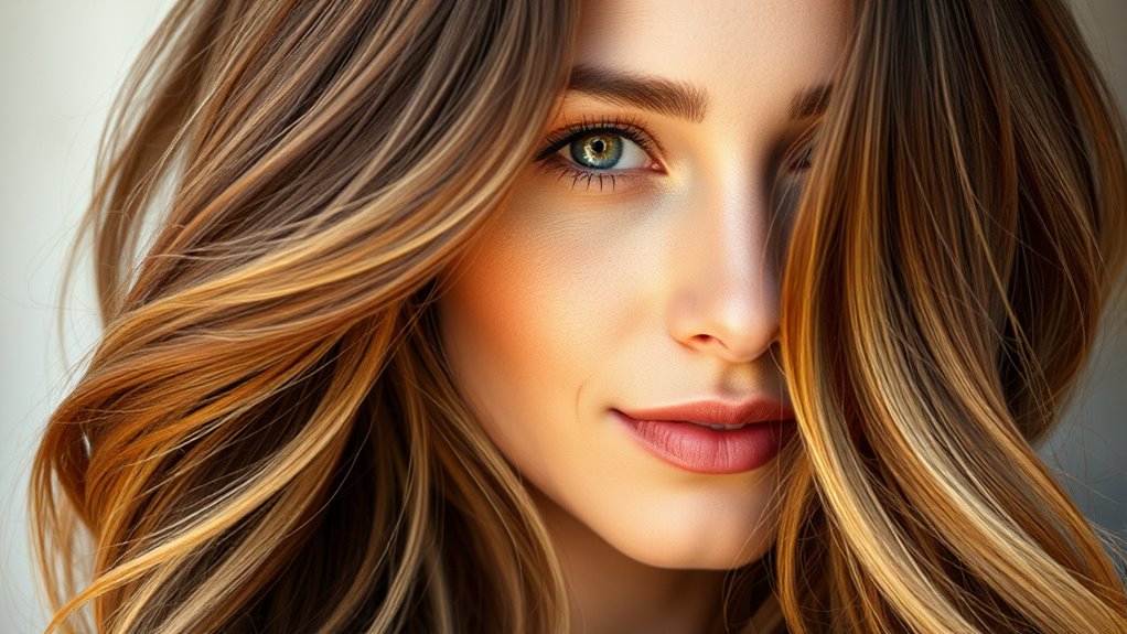 Bronde is the perfect balance between brown and blonde, giving you a natural, multidimensional look that suits many skin tones. It blends warm, rich brown shades with sun-kissed blonde highlights using techniques like balayage, which creates a soft, seamless shift. This versatile color is low-maintenance and versatile, so you can enjoy a vibrant, authentic style without frequent touch-ups. Keep exploring to discover more tips on achieving and maintaining that flawless bronde look.