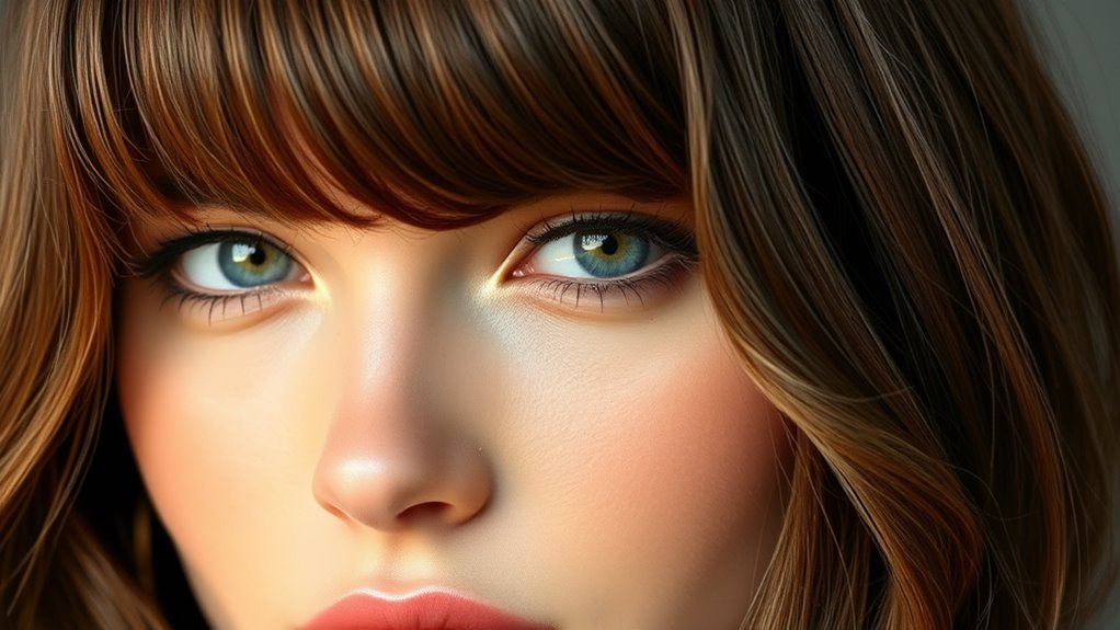 You’ll find that curtain bangs work best with straight or wavy hair textures because they blend seamlessly and are easier to style. If you have curly or coily hair, you can still rock them, but expect more maintenance to keep the bangs looking polished. To make styling easier, use lightweight styling creams and avoid excessive heat. Regular trims also help maintain their shape and prevent split ends.