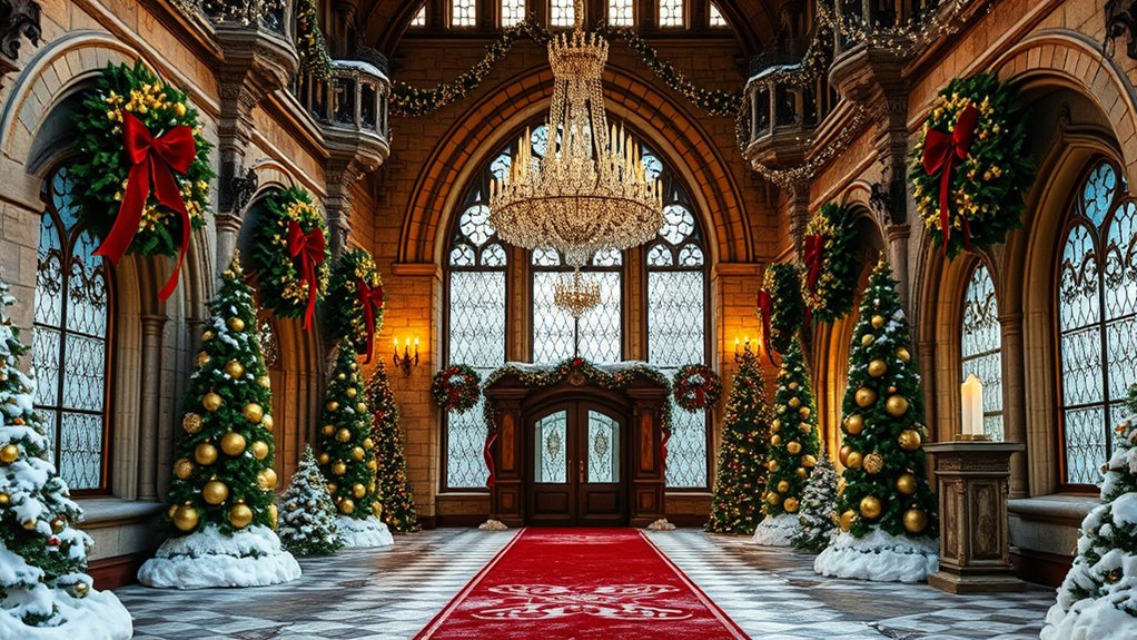 You should choose deep, rich shades like regal burgundy, royal blue, and emerald green for a castlecore holiday theme. Incorporate medieval color palettes with gold and silver accents to add a touch of elegance, while warm reds and velvety purples evoke royal holiday hues. These colors create a majestic, festive atmosphere that feels both historical and luxurious, perfect for transforming your space into a regal winter wonderland.