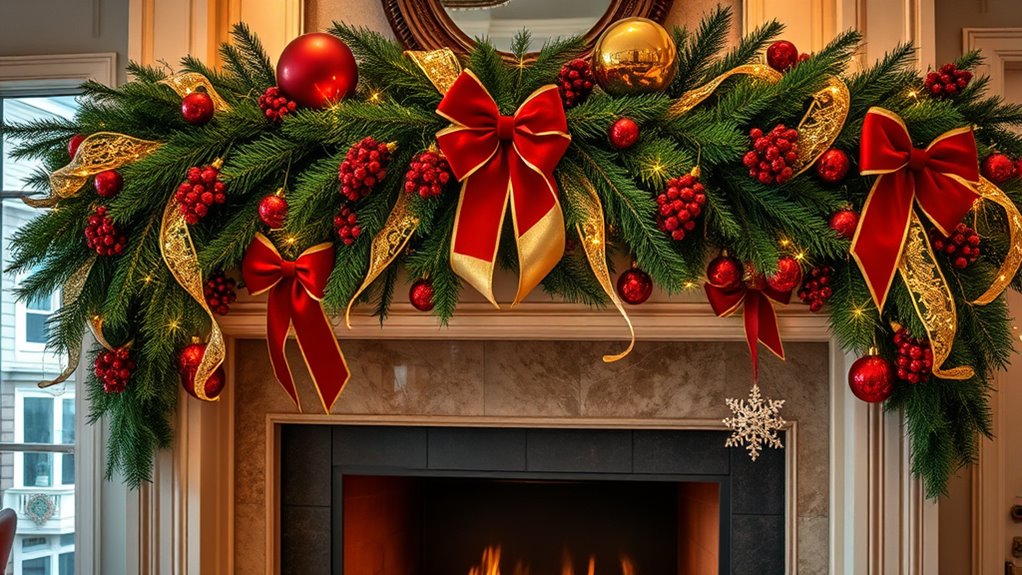 An extra-large garland instantly creates a dramatic holiday statement that grabs attention and sets a festive tone. You can enhance its impact by choosing bold ornaments, coordinating colors, and layering warm or multicolored lights for a cozy glow. Securely hang it across doorways, mantels, or staircases for maximum visual effect. Thoughtful placement and decoration selection will turn your space into a show-stopping centerpiece, making your holiday decor truly unforgettable—continue exploring to discover more ideas.