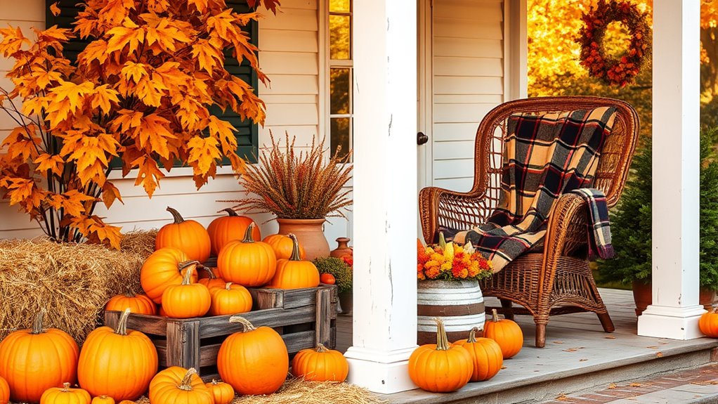 Finally, pay attention to the arrangement’s symmetry and flow. Position larger pumpkins and hay bales as focal points, then fill in with smaller gourds and decorative accents. During the day, your display will captivate visitors with its vibrant harvest color schemes, and at night, the carefully chosen seasonal lighting ideas will cast a cozy, enchanting glow. With these simple steps, your porch will become a charming autumn haven that invites everyone to enjoy the spirit of the season.