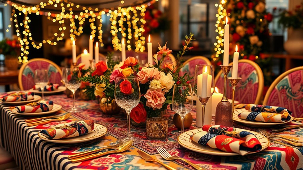 Have you ever wondered how a beautifully crafted tablescape can transform a festive gathering? The secret lies in your ability to mix patterns and layers thoughtfully, creating a mesmerizing visual experience. When designing your table, start by selecting a cohesive theme that guides your choices, especially when it comes to holiday color schemes. Think about traditional reds, greens, and golds, or opt for more modern palettes like icy blues and silvers. Your color scheme sets the tone and helps unify diverse patterns, ensuring the overall look remains harmonious rather than chaotic.