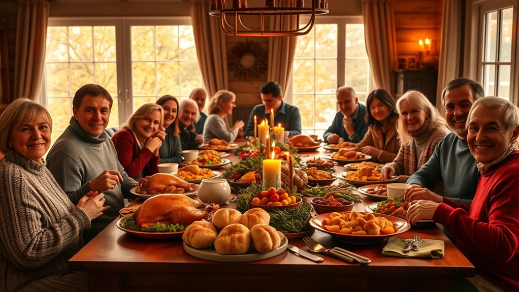 You can make your table festive by using a stunning centerpiece, like a cornucopia or autumnal floral arrangement, to set a warm tone. Incorporate themed place cards that match your décor or seasonal motifs, adding a personal touch for each guest. Use layered linens and colorful chargers to create visual interest, and arrange seating in a way that encourages conversation. These ideas will make your larger gathering feel cozy and memorable.