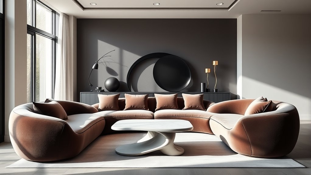 Curves are back in style, transforming furniture and decor into mesmerizing sculptural pieces that blend artistry with function. You’ll notice flowing lines inspired by nature, bold silhouettes, and innovative shapes that draw attention and add personality to any space. These pieces aren’t just eye-catching—they impact your atmosphere with movement, harmony, and creativity. If you want to discover how these designs elevate interiors beyond traditional decor, keep exploring the exciting world of sculptural forms.