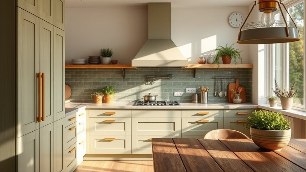 When it comes to your overall color palette, embracing sage, olive, and forest hues can amplify your eco-conscious design. These shades evoke a sense of tranquility and connect you with nature. Painting your walls in soft sage or olive tones creates a soothing backdrop that complements natural materials. Incorporate accents like plant-based decorative elements or recycled glass jars to enhance the organic feel. These colors also pair beautifully with natural wood finishes and stone countertops, strengthening your kitchen’s eco-friendly vibe. Exploring sustainable materials for your surfaces and accents can further enhance this eco-conscious approach.