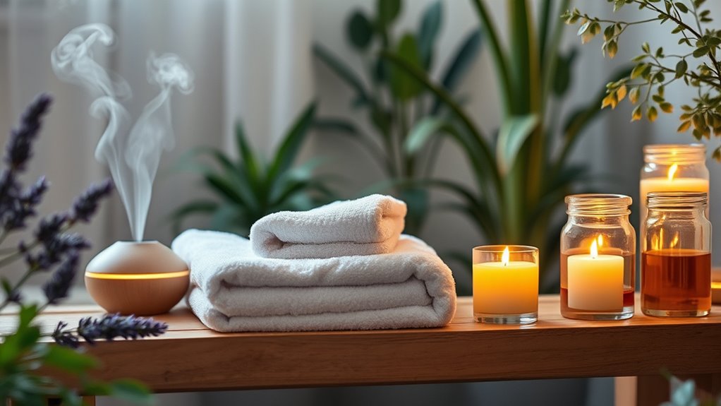 While you’re at it, create a dedicated space. Arrange soft towels, plush robes, and cozy slippers nearby so you can relax completely. Keep your favorite music at a soft volume to complement the lighting and scents, encouraging a state of deep calm. Incorporate elements that make you feel pampered—perhaps a small plant or calming artwork—to increase the overall sense of serenity. The goal is to craft a space that encourages mindfulness and self-care, where you can unwind fully. By thoughtfully combining lighting, aromatherapy, skincare routines, and massage techniques, you turn your home into a sanctuary. It’s all about creating an environment that nurtures your body and mind, so you can escape from daily stress and enjoy a truly restorative experience right at home.