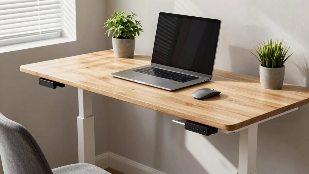 To guarantee you get the most comfort from your standing desk, it’s essential to adjust it correctly from the start. Proper setup helps prevent strain and promotes good posture. Begin by setting your desk height so that your elbows are at a 90-degree angle when your arms are relaxed at your sides. Use standing desk accessories like anti-fatigue mats or monitor arms to enhance comfort. Keep your monitor at eye level to avoid neck strain. Incorporate ergonomic posture tips by ensuring your wrists are straight and shoulders relaxed. Additionally, considering the ergonomic design of your workspace can greatly improve overall comfort and reduce fatigue. Here’s how to fine-tune your setup:
