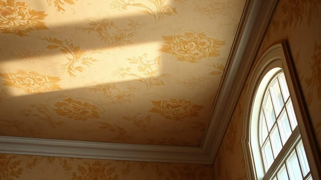 Think of your ceiling as a delicate garden—moisture can be its worst enemy. Ceiling wallpaper isn’t ideal for humid or damp areas unless you choose moisture-resistant options designed to withstand the environment. For proper ceiling wallpaper maintenance, opt for special moisture-resistant wallpaper options that keep your ceiling looking fresh. Without these, humidity can cause peeling, mold, or damage, turning your beautiful space into a soggy nightmare.