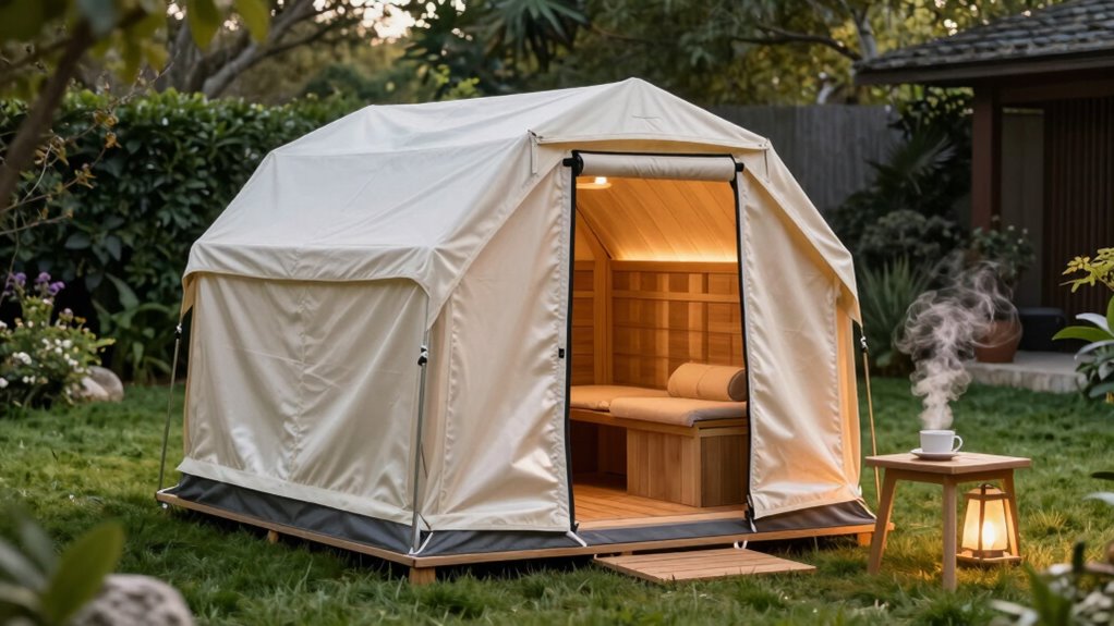 They say “silence is golden,” and that’s true for sauna tents. During operation, noise levels are generally low, thanks to built-in sound insulation. You might hear gentle hums from the heater, but loud noises are rare. Most sauna tents are designed to keep sound contained, so you can relax without disruptive noise. If noise is a concern, check for models with enhanced soundproofing to guarantee a peaceful experience.