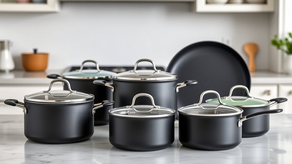 Have you ever considered what materials are truly safe for your cookware? It’s essential because harmful chemicals like PFOA, PTFE, lead, and cadmium can leach into your food if the materials aren’t properly regulated. I look for cookware that meets strict safety standards, such as ceramic coatings tested for non-toxicity, ensuring they’re free from these dangerous substances. Regulatory agencies like the FDA set benchmarks that manufacturers must follow, giving me confidence that my cookware won’t release toxins during cooking. High-quality materials are also tested for durability and safety, which means I can cook with peace of mind about my health and the environment. Prioritizing these standards helps me choose cookware that’s both safe and reliable for long-term use.