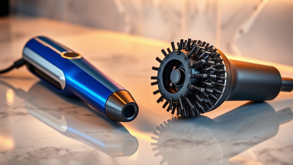 When comparing the Shark FlexStyle and Dyson Airwrap, examining their attachments and accessories is essential, as these determine the range and quality of your styling options. I look at the variety of tools included, like curlers, brushes, and concentrators, to see if they meet my styling needs. Compatibility with my hair type and desired styles, such as volume or smoothing, is vital. I also consider how easy it is to switch and store attachments—magnetic attachments are more convenient than manual clips. Specialized features like Coanda technology or auto-wrap curlers can make styling more efficient and gentle. Additionally, I check if there are extra accessories or replacement parts available, offering expanded versatility over time.
