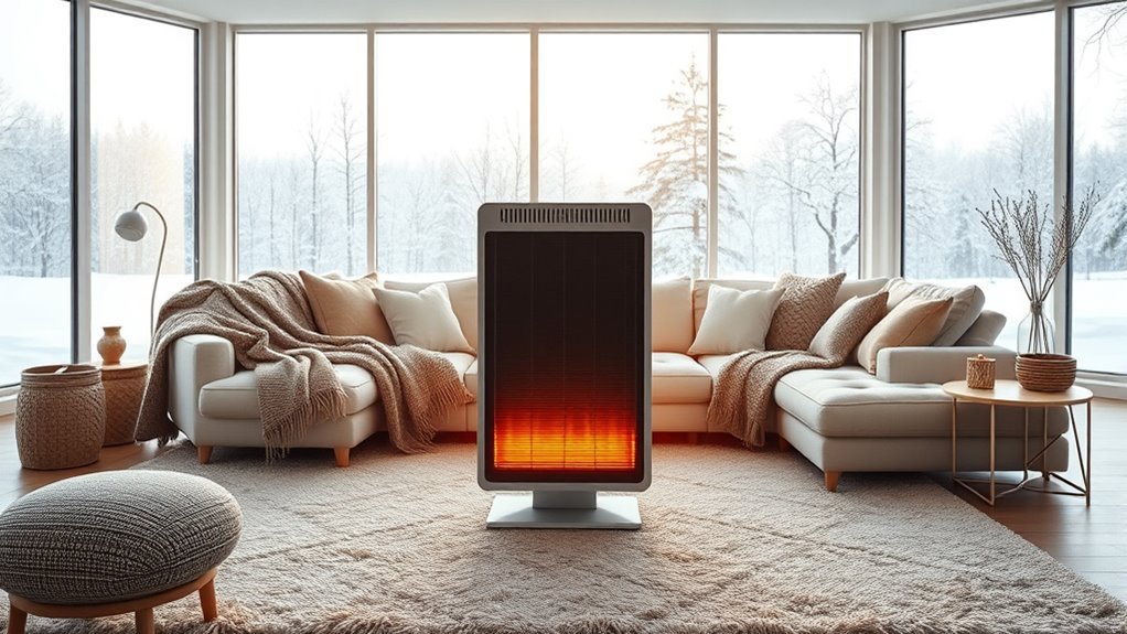Safety features and certifications are vital considerations to make certain your space heater operates securely in a large room. Look for models with ETL or UL certifications, which confirm they meet industry safety standards. Built-in safety features like tip-over protection and overheat shutoff are essential for preventing accidents and damage. Choose heaters made from flame-retardant materials, such as V-0 rated plastics, to reduce fire risks. A cool-touch exterior helps prevent burns if you accidentally touch the heater during operation. Additionally, safety mechanisms like reinforced electrical components and child lock features add extra layers of protection. Prioritizing these aspects ensures peace of mind while keeping your large space warm and safe throughout the winter.