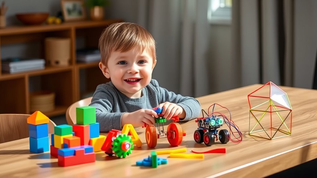If you’re looking for the best STEM toys to spark your toddler’s creativity and learning, I recommend options like magnetic tiles, building sets, and beginner microscopes tailored for their age. These toys promote problem-solving, fine motor skills, and early STEM concepts, all made from safe, durable materials. Choosing age-appropriate and expandable toys guarantees your child stays engaged and challenged. Keep exploring further to find the perfect STEM toys that will grow with your little one.