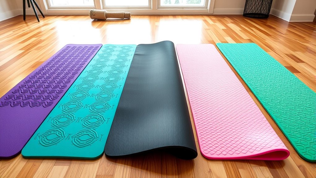 Choosing a yoga mat with a non-slip surface is vital for maintaining safety and stability during your practice. The surface is usually made from textured PVC, TPE, or natural rubber, all designed to provide strong grip even when you sweat. The textured pattern helps prevent slipping, which is especially important for dynamic poses. Factors like surface pattern depth and material density influence how much friction your mat offers. Some mats feature dual-texture surfaces, giving you options for different practice intensities. To keep your mat performing its best, regular cleaning is indispensable, as dirt and sweat can diminish grip over time. Selecting a mat with the right material ensures you maintain stability and safety throughout your yoga sessions.